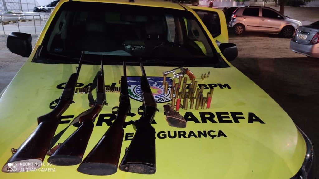 No total foram apreendidas 4 espingardas calibres 20, 28 e 40, 1 revólver calibre 32 além de 5 munições do mesmo calibre.