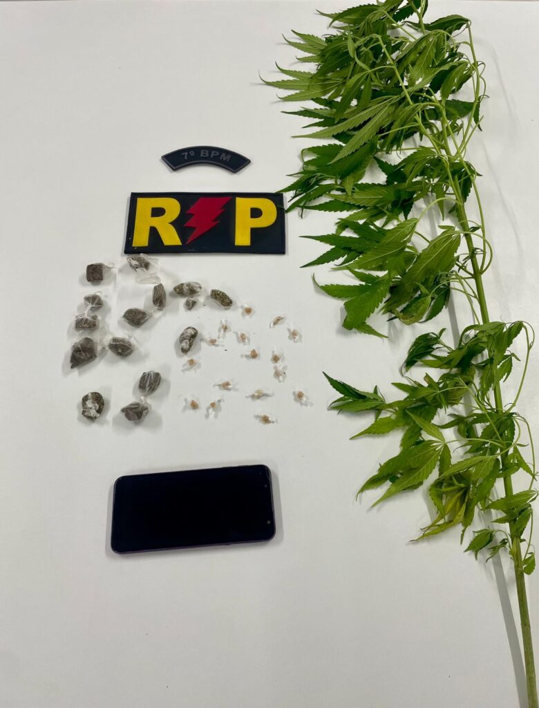 Foram apreendidos no total 15 trouxinhas de maconha, 16 pedras de crack, 1 planta cannabis, 1 celular, 1 caixa de som e R$ 20,00 em espécie.
