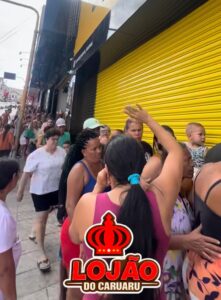 Uma fila gigante formada por clientes para aproveitar a promoção em uma loja na manhã deste sábado (7), dia de