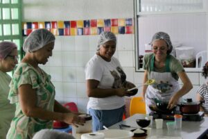 Merendeiras, professoras, mães e pais de alunos participaram de uma imersão sobre alimentação saudável no Centro Municipal de Educação Infantil