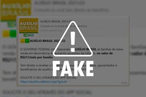 Circula em grupos do WhatsApp uma mensagem sobre um suposto aplicativo para solicitação do programa Auxílio Brasil. A informação é