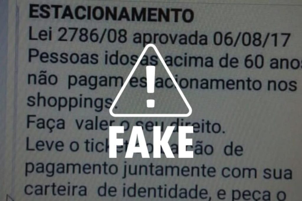 A informação é compartilhada em formato de texto. “Estacionamento. Lei 2786/08 aprovada em 06/08/17. Pessoas idosas acima de 60 anos não pagam estacionamento nos shoppings. Faça valer o seu direito. Leve o ticket ao balcão de pagamento juntamente com sua carteira de identidade e peça o carimbo de isenção”, diz a mensagem.