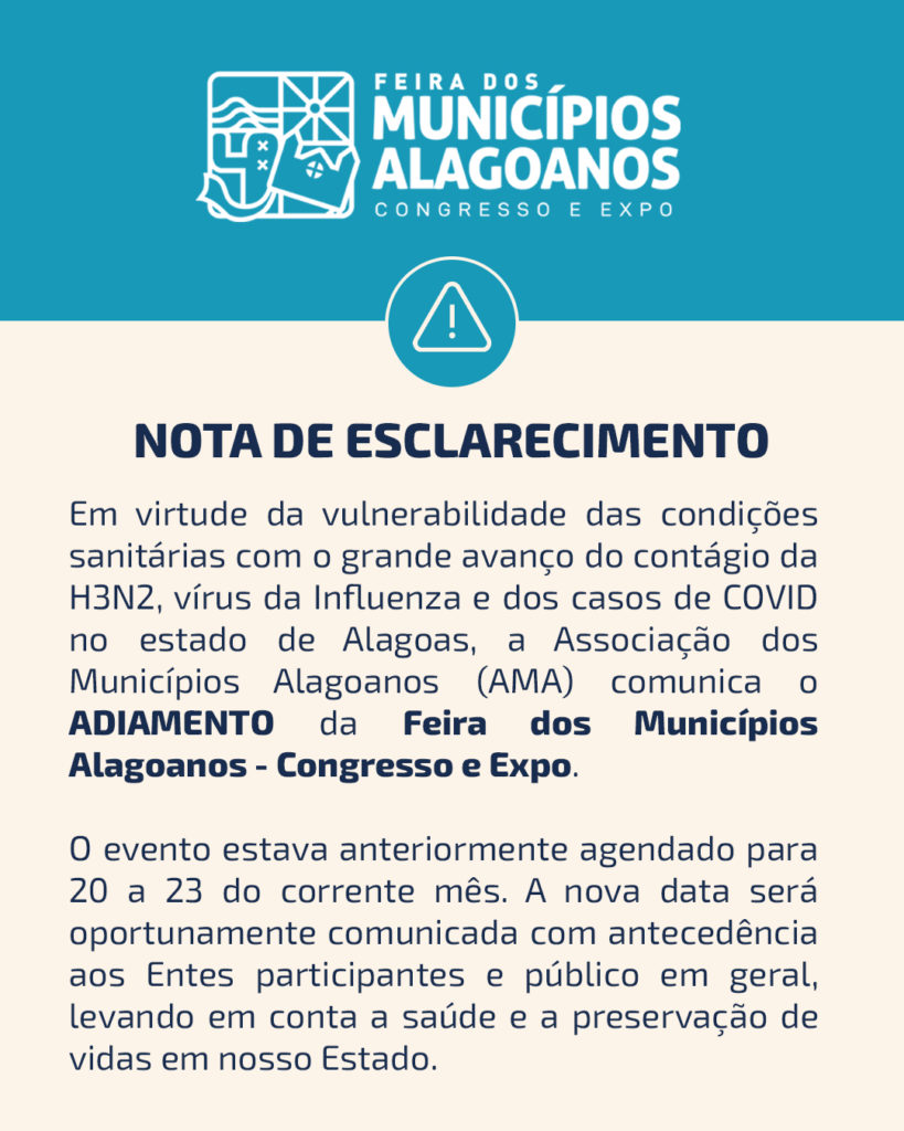Em virtude da vulnerabilidade das condições sanitárias com o grande avanço do contágio da H3N2, vírus da Influenza e dos casos de COVID no estado de Alagoas, a Associação dos Municípios Alagoanos (AMA) comunica o ADIAMENTO da Feira dos Municípios Alagoanos – Congresso e Expo. O evento estava anteriormente agendado para 20 a 23 do corrente mês. A nova data será oportunamente comunicada com antecedência aos Entes participantes e público em geral, levando em conta a saúde e a preservação de vidas em nosso Estado.