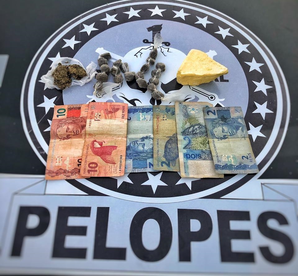 Foram apreendidos 21 bombinhas de maconha, 109 gramas de substância análoga a cocaína/crack, R$ 28,00 e um aparelho celular.