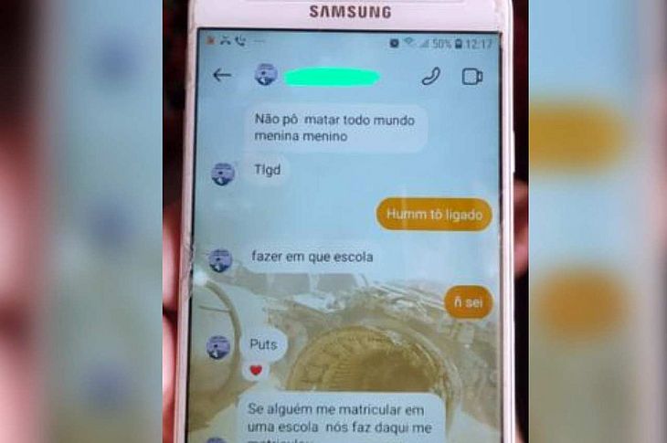 Em mensagem de celular interceptada pela Polícia de Goiás, segundo o jornal “O Globo”, um deles descreve que “vai matar todo mundo”. Segundo a polícia de Goiás, o adolescente estava com viagem marcada para encontrar o outro no interior do Rio Grande do Norte para encontrar o primo.