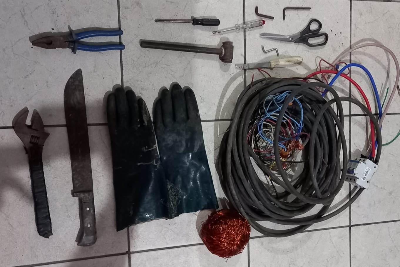 Os militares foram acionadas via Copom para atender a uma denúncia de um possível furto que teria ocorrido em uma indústria da região. No local, foram encontrados dois indivíduos portando o material que fora subtraído da fábrica: um par de luvas antichoque, uma chave-teste, um facão, fios e cabos de cobre, uma tesoura e um saco de naylon.
