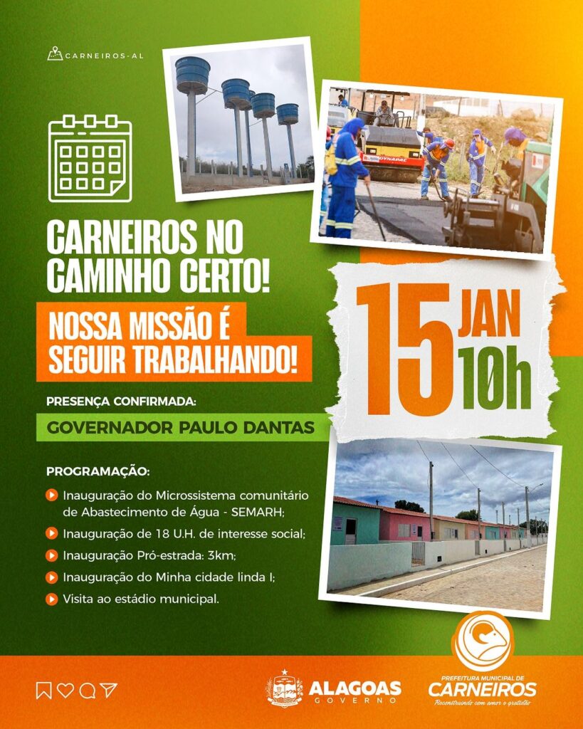 As obras de habitação e infraestrutura compõem o plano de governo desenvolvido especialmente para gerar desenvolvimento para Alagoas, beneficiando, principalmente, as famílias de baixa renda, com mais oportunidades e qualidade de vida. Carneiros é um dos 24 municípios já beneficiados por um dos programas habitacionais comandados pela Seinfra.