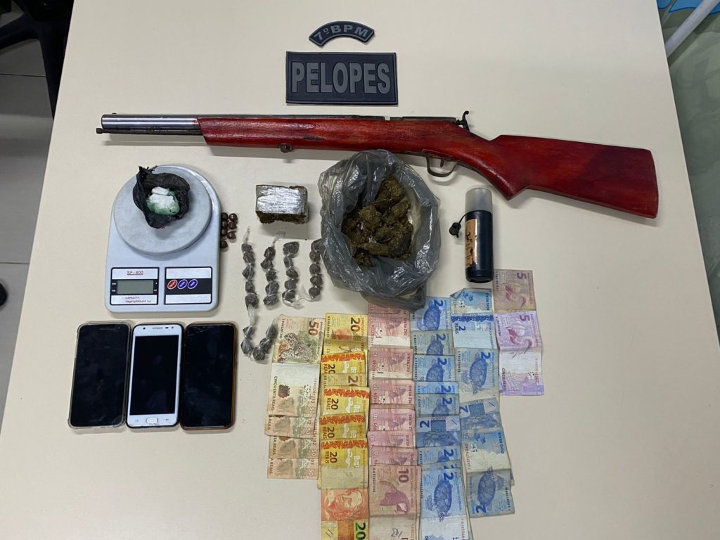 As guarnições do Pelotão de Operações Especiais (PELOPES) do 7º Batalhão de Polícia Militar (7º BPM) desarticularam um grupo acusado de associação para o tráfico de drogas e posse ilegal de arma de fogo. Com eles os militares apreenderam drogas, arma e dinheiro em espécie.