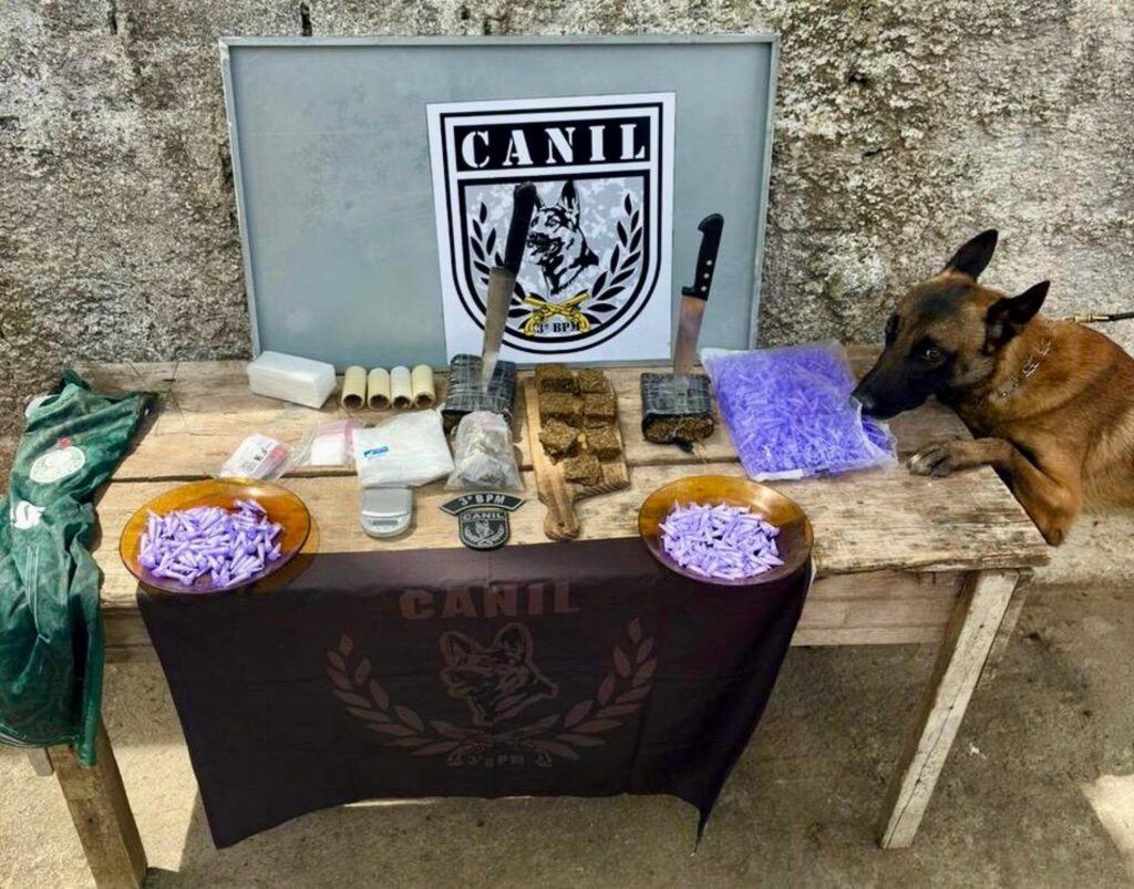 Durante as buscas no local, o cão farejador Bereta apontou para uma sacola abandonada, onde foram encontrados aproximadamente 850 gramas de maconha, divididos em barras e porções menores, além de 199 pinos de cocaína, diversos sacos plásticos, pinos vazios e uma balança de precisão. Todo o material foi apreendido e encaminhado à Central de Polícia Civil.