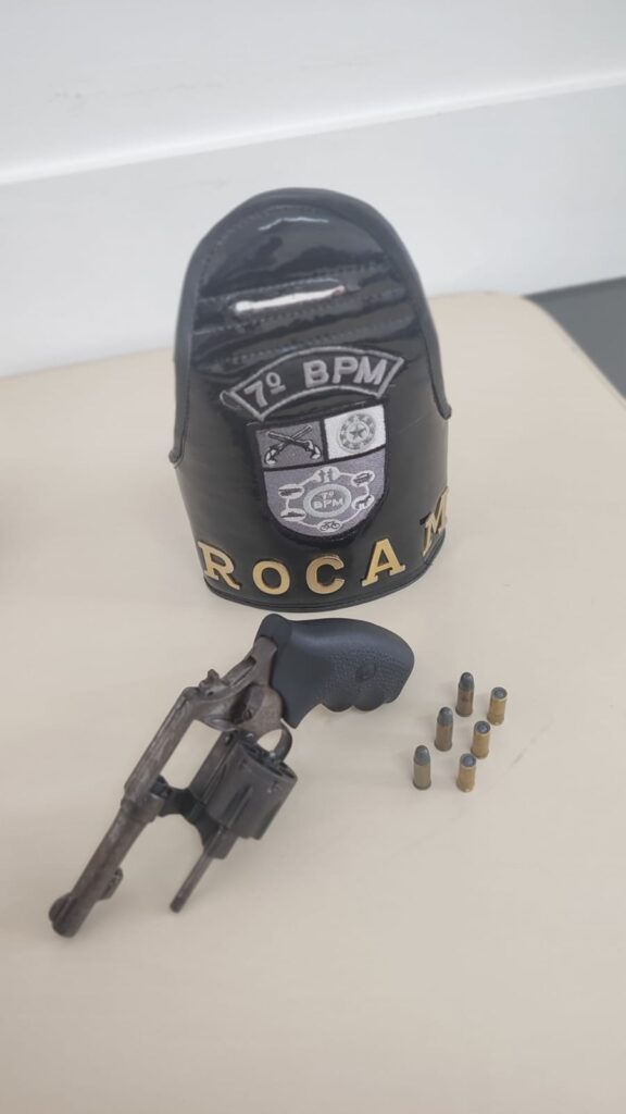 Diante da situação, os policiais se aproximaram e observaram o momento em que o suspeito arremessou algo para dentro do imóvel. O homem foi abordado imediatamente e, durante buscas no interior da casa, os militares localizaram um revólver calibre .32 com seis munições intactas próximo ao fogão, na cozinha.