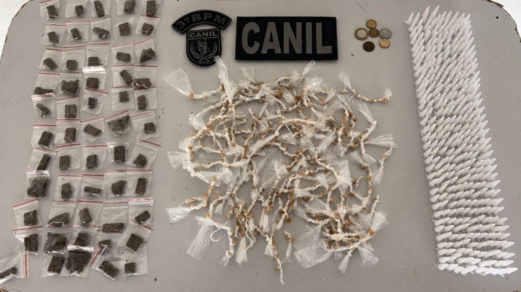 Já durante patrulhamento no bairro Manoel Teles, a guarnição do Canil empregou o cão farejador K9 Bill em um terreno e imóvel abandonados. O animal indicou um ponto específico onde foi localizada uma sacola contendo 55 papelotes de maconha, 177 pinos de cocaína e 318 pedras de crack. Como não houve identificação de responsável pelo material, todo o entorpecente foi apreendido e encaminhado à Central de Polícia para os procedimentos legais.