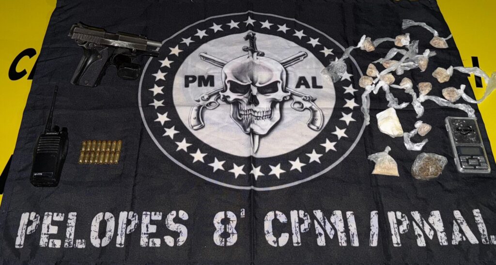 Durante a ação, o suspeito foi flagrado com uma pistola calibre .380, com 15 munições intactas, além de 14 pedras de crack, 160 gramas de maconha, 440 gramas de cocaína, um radiocomunicador e uma balança de precisão.