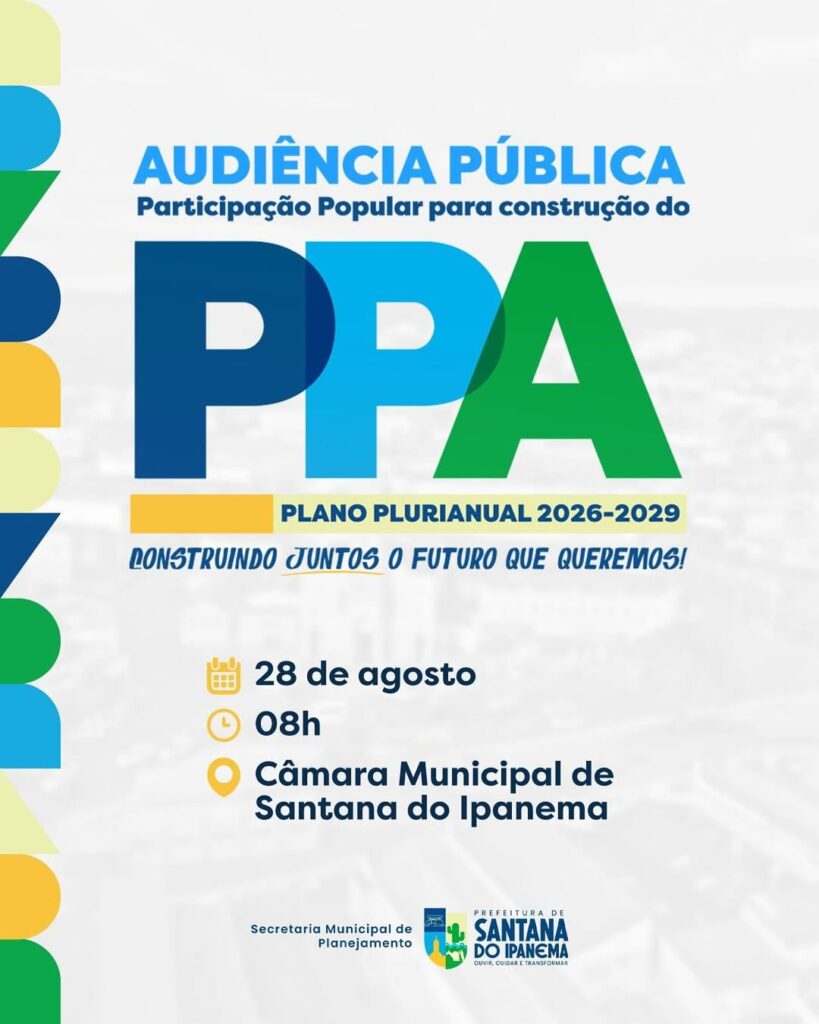A Prefeitura de Santana do Ipanema realiza na próxima quinta-feira (28), às 8h, na Câmara de Vereadores, uma audiência pública para discutir a construção do Plano Plurianual (PPA) 2026-2029.