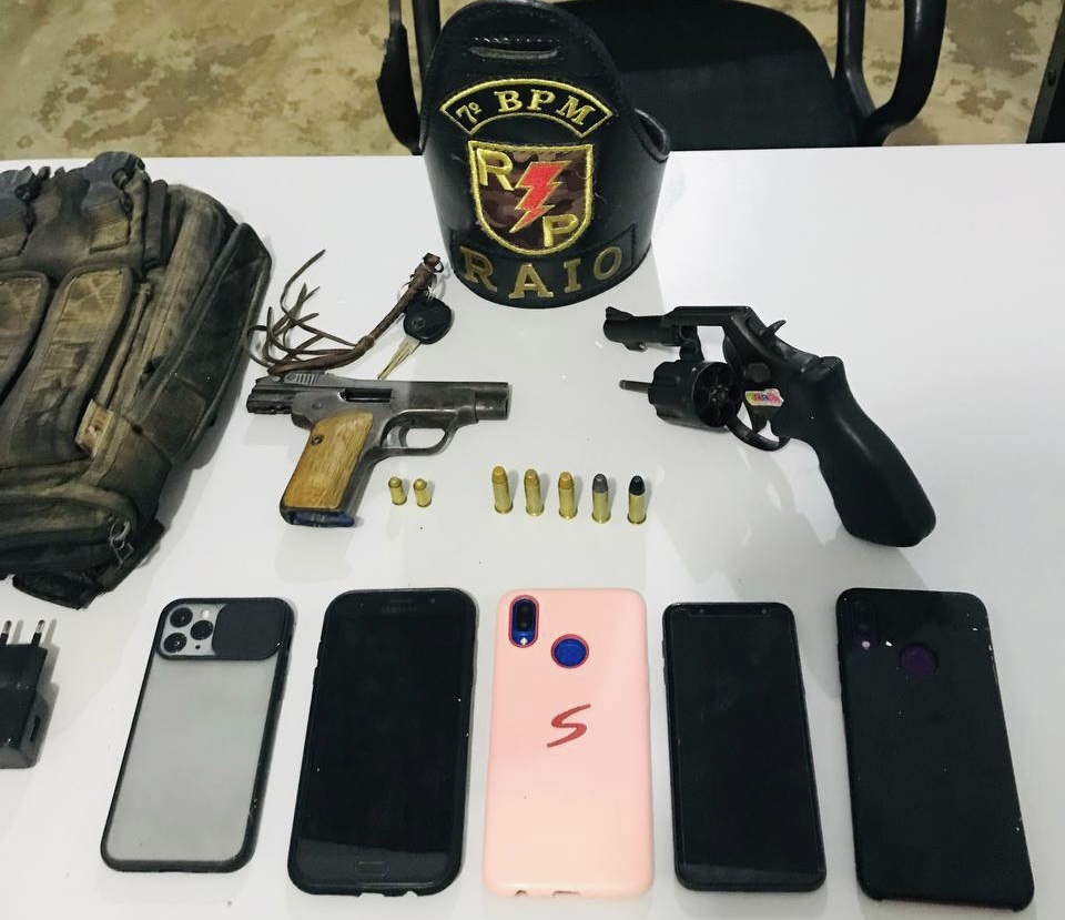 De acordo com a Polícia Militar, com informações de um roubo ocorrido no Sítio Queimadas, zona rural do município, de pronto, a RP foi dar apoio a Força Tarefa que estava em acompanhamento a um veículo de cor prata. Durante buscas, a RP avistou um veículo com as mesmas características, foi dada ordem de parada e feita a abordagem a 4 indivíduos. Um deles jogou um revólver calibre 38 pela janela do carro, sendo localizado em seguida após uma revista no perímetro. Outra arma – pistola calibre 32 – também foi apreendida dentro do carro. No interior do veículo foram apreendidos ainda 5 aparelhos celulares das marcas (1 Apple, 1 Redmi e 3 Samsung). Os aparelhos são produtos de roubo.