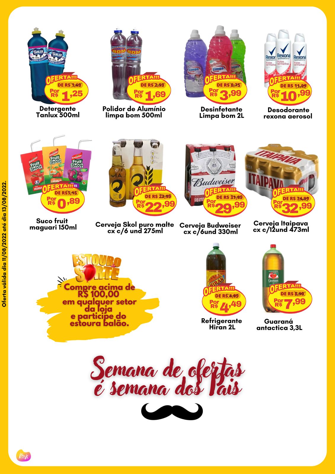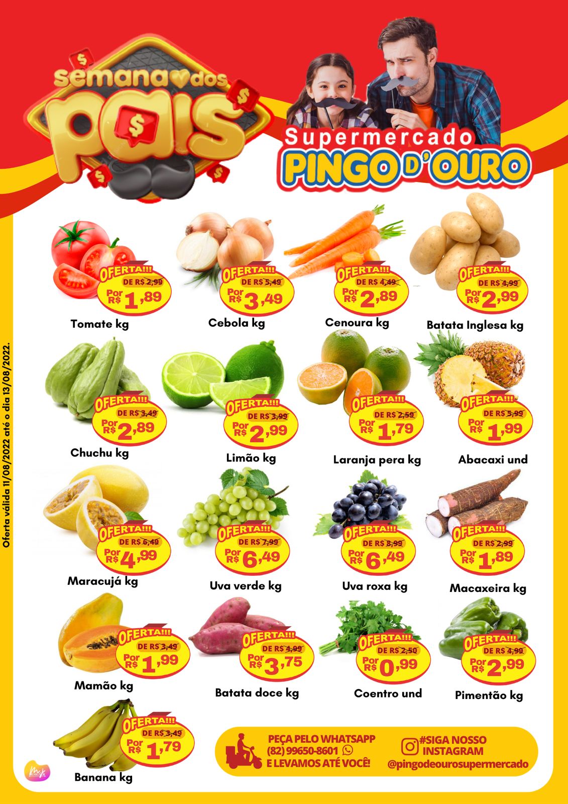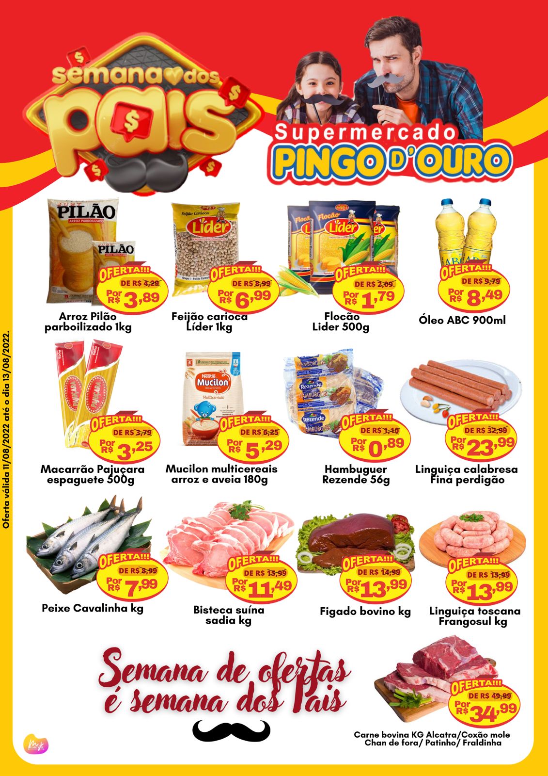 O Supermercado Pingo de Ouro lançou diversas promoções nesta semana dos pais, tendo inídio nesta quinta-feira (11) e validade até o sábado (13), para comemorar o Dia dos Pais. Com isso, baixou o preço em diversos produtos de limpeza, açogue, bebidas, mercearia, dentre outros.